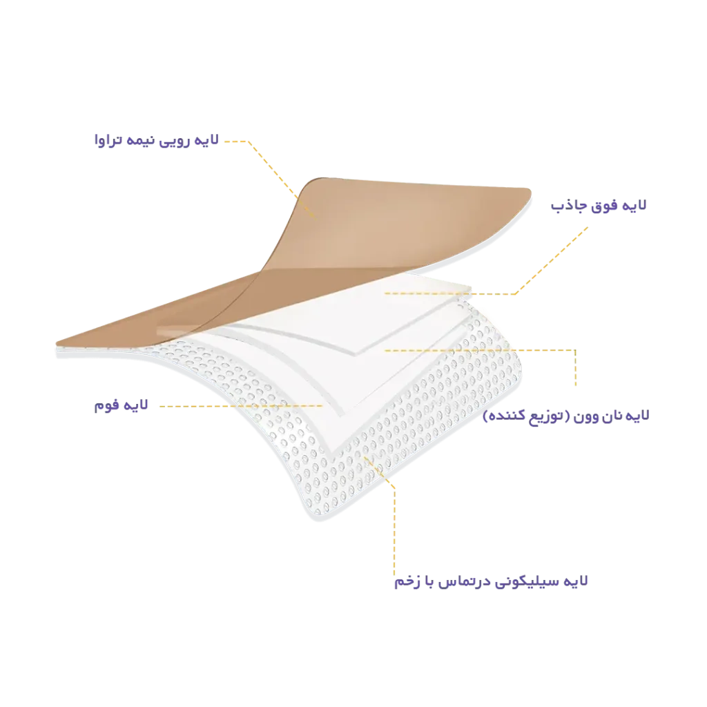 این پانسمان از لایه فوم سوپر جاذب نرم و انعطافپذیر تولید شده است که به پوست نمیچسبد و برای بیمار ایجاد ناراحتی نمیکند. لایه فوم سوپر جاذب سبب میشود تا پانسمان ترشحات زخم را به طور موثر جذب کند و محیط زخم را مرطوب نگه دارد.