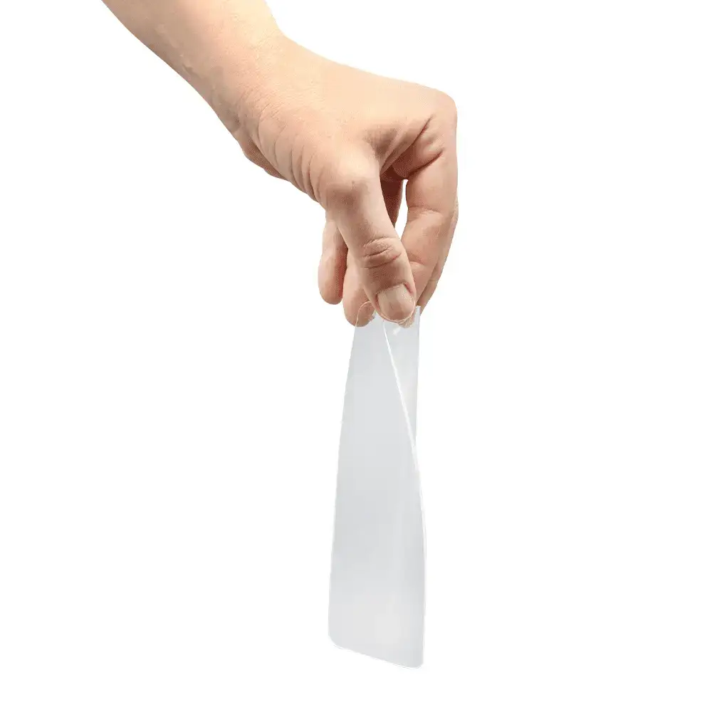 • سپس روکش محافظ پلاستيکی اسکارشیت را از آن جدا می‌کنيم و طرف چسبناک آن را بر روی اثر زخم می‌چسبانيم. (توجه داشته باشید که نوار سیلیکونی را به هیچ عنوان نکشید.)